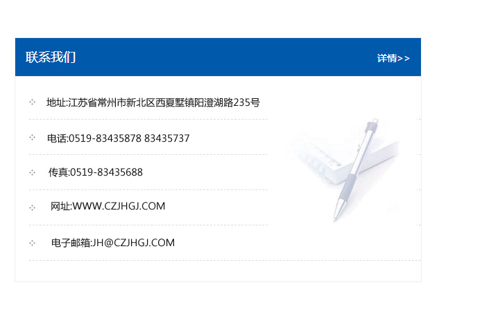 地址:常州市新北區友邦商務大廈1幢16、17層  電話:0519-85101652  傳真:0519-85112595  郵編:213022  網址:www_hangzhongjixie_com.zhyw1688.com  郵箱:xiajifengaa@163.com